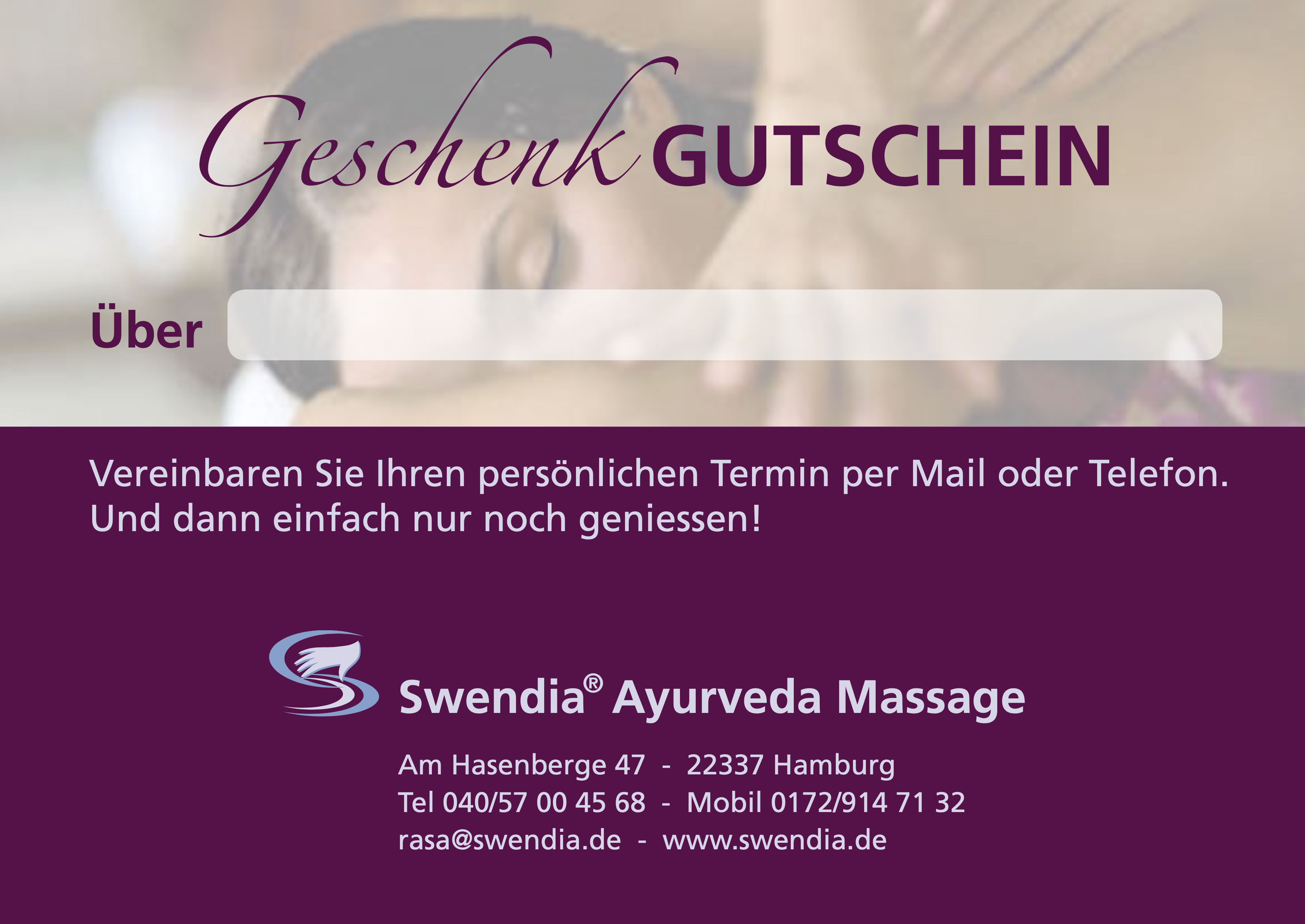 Dann haben Sie hier die Möglichkeit, sich einen bzw. mehrere Gutscheine über eine Swendia® Massage via Mail zukommen zu lassen.
